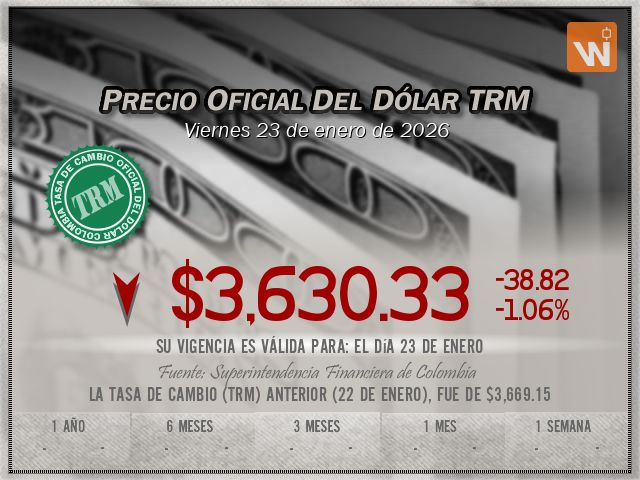 Ha disminuido a su nivel más reducido desde el martes 15 de junio de 2021, cuando quedó en $3,626.02, un nivel que no se había registrado hace 4 años y 8 meses.La TRM para el día 23 de enero se fijó el día jueves 22 de enero, después de cerrar el mercado SPOT al cerrar con un precio completamente distinto a como inició la jornada (inestabilidad política y/o económica una de las variables), creando una diferencia de -38.82 pesos respecto a la Tasa Representativa del Mercado (TRM) anterior, a pesar de que la sesión inició con ganancias, muy pronto se esfumaron y revirtió la tendencia.