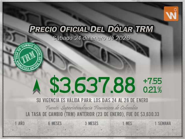La TRM para los días 24 al 26 de enero se fijó el día viernes 23 de enero, después de cerrar el mercado SPOT después de unos movimientos con bastante contraste desde el inicio, apartándose de la Tasa Representativa del Mercado (TRM) anterior apenas unos 7.55 pesos, aunque la apertura fué negativa, los precios se recuperaron y cerraron de forma alcista.