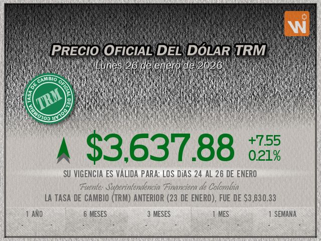 La TRM para los días 24 al 26 de enero se fijó el día viernes 23 de enero, después de cerrar el mercado SPOT después de unos movimientos con bastante contraste desde el inicio, apartándose de la Tasa Representativa del Mercado (TRM) anterior apenas unos 7.55 pesos, aunque la apertura fué negativa, los precios se recuperaron y cerraron de forma alcista.