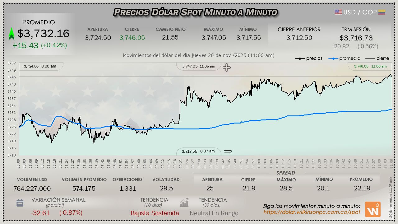 En esta primera hora del jueves, el dólar SPOT tiene un incremento consistente desde el comienzo de la jornada, con un valor medio de $3,728.78, escasamente por arriba de los $12.05 pesos (aunque hay una tendencia al alza, no logra compensar las pérdidas de la jornada anterior), sobre la Tasa Representativa del Mercado (TRM), establecida en $3,716.73 pesos.
