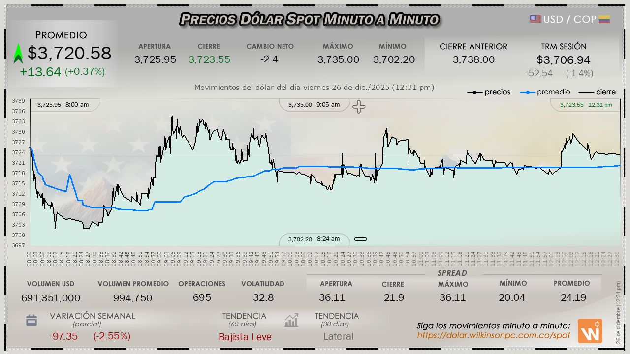 A lo largo de la sesión de hoy en el mercado SPOT, el dólar ha registrado un alza al comienzo del día, y aunque perdió fuerza, la dirección ascendente persiste, con un precio medio de $3,720.58, escasamente por arriba de los $13.64 pesos (aunque hay una tendencia al alza, no logra compensar las pérdidas de la jornada anterior), sobre la Tasa Representativa, definida en $3,706.94 pesos.