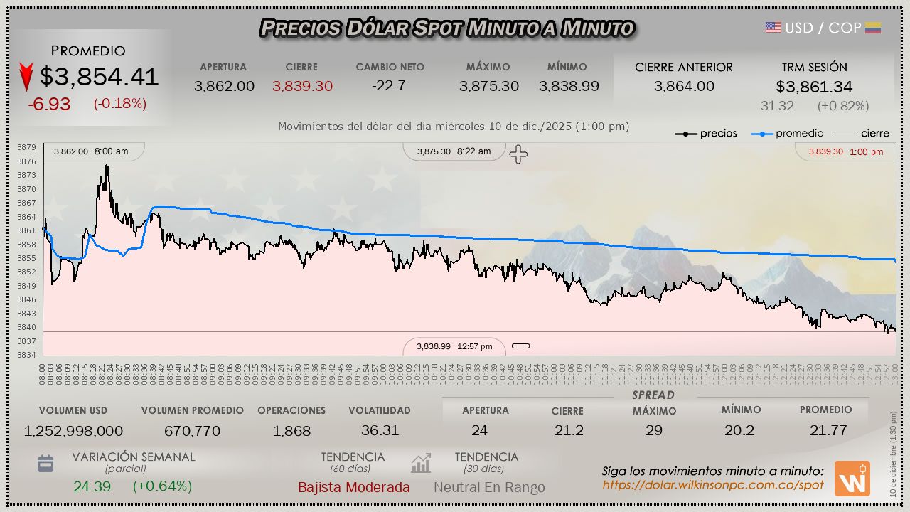 A lo largo de la sesión de hoy en el mercado SPOT, el dólar ha registrado una pérdida respecto al impulso con el que inició la jornada y continúa a la baja, con un valor medio de $3,857.79, escasamente por debajo de $-3.55 pesos (aún con la tendencia a la baja, no consigue erosionar las ganancias de la jornada previa), de la Tasa Representativa del Mercado (TRM), determinada en $3,861.34 para la sesión.