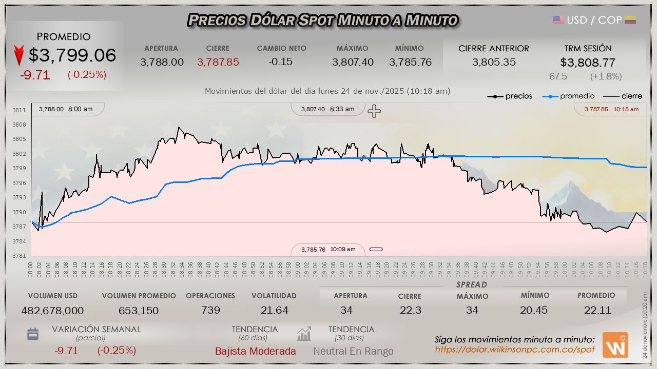 En el mercado SPOT, el dólar en la jornada del lunes, observa un aumento únicamente en comparación con su valor al inicio de la sesión, con un valor promedio de $3,799.06, con una pequeña caída de $-9.71 pesos (a pesar del descenso, no logra disminuir las ganancias de la sesión anterior), comparada a la Tasa Representativa del Mercado (TRM), establecida en $3,808.77 pesos.