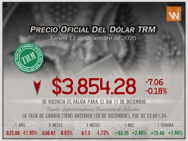 Esta es la TRM vigente del jueves 11 de diciembre de 2025. Un (1) dólar estadounidense equivale a $3,854.28 (tres mil ochocientos cincuenta y cuatro pesos con veintiocho centavos colombianos).