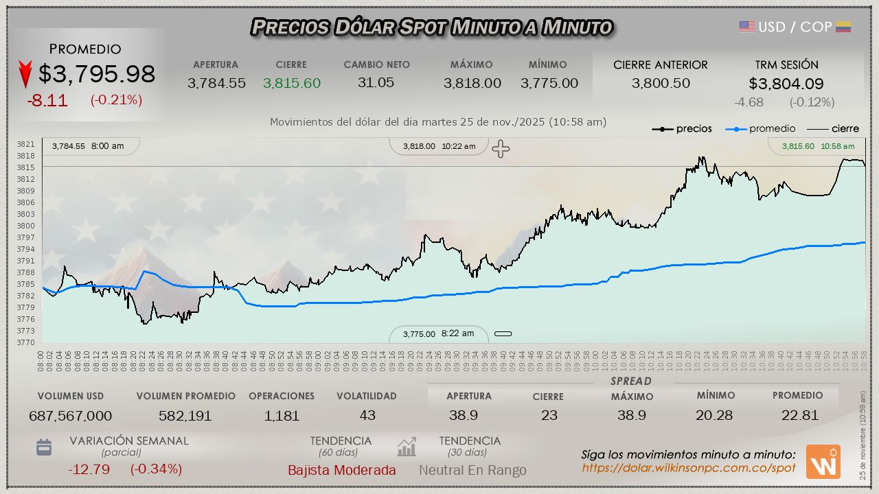 En lo que va de la jornada del mercado SPOT del martes, el dólar muestra un descenso continuado desde la apertura, con un valor corriente de $3,781.86, con un margen por debajo de la Tasa Representativa del Mercado (TRM), inferior en $-22.23 pesos (aumentando las pérdidas de la sesión anterior), la TRM mencionada asignada en $3,804.09 para la sesión.