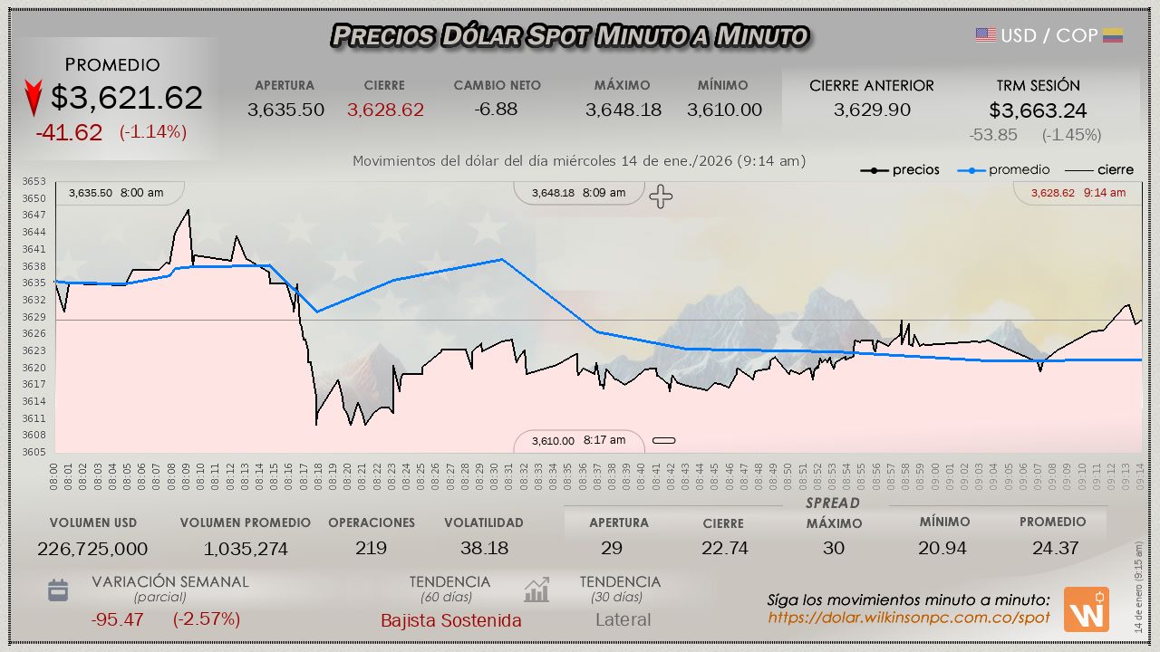 A esta hora el mercado SPOT del día miércoles, muestra un descenso continuado desde la apertura, con un valor promedio de $3,635.08, registrando una desventaja frente a la TRM de $-28.16 pesos (ampliando las pérdidas de la jornada previa), la TRM en cuestión establecida en $3,663.24 para la sesión.