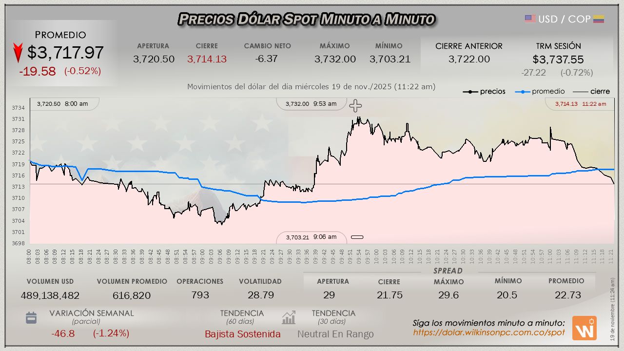 El mercado del dólar SPOT, en la jornada del miércoles, tiene una tendencia a la baja desde el arranque de la sesión, a un precio corriente de $3,710.05, inferior a la Tasa Representativa del Mercado (TRM), quedándose por debajo en $-27.50 pesos (aumentando las pérdidas de la sesión anterior), dicha TRM fijada en $3,737.55 para la sesión.