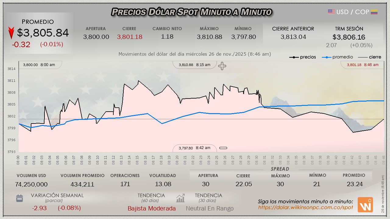El mercado del dólar SPOT, a primera hora del miércoles, tiene un aumento únicamente en comparación con su valor al inicio de la sesión, con un valor medio de $3,804.52, con apenas una variación de tan solo $-1.64 pesos (a pesar del descenso, no logra disminuir las ganancias de la sesión anterior), parcialmente por debajo de la Tasa Representativa del Mercado (TRM), que para la sesión estaba en $3,806.16.