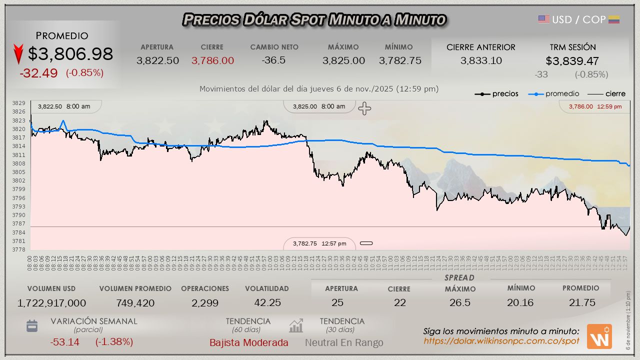 El mercado SPOT concluyó el jueves, evidenciando un descenso continuado desde que inició la jornada, el valor medio se situó en $3,806.98, alejándose significativamente de la Tasa Representativa del Mercado (TRM), perdiendo $-32.49 pesos, la TRM referida fijada en $3,839.47 para el día.