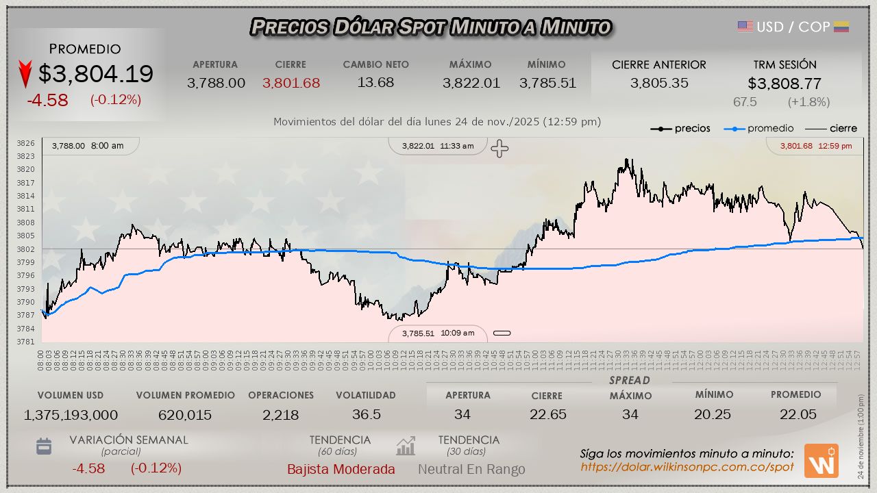 En el mercado SPOT, el dólar finalizó la jornada del lunes, evidenciando una recuperación sólo respecto a la apertura de la sesión, con un precio promedio de $3,804.19, una caída muy leve de $-4.58 pesos respecto a la Tasa Representativa del Mercado (TRM), que para la sesión estaba en $3,808.77.