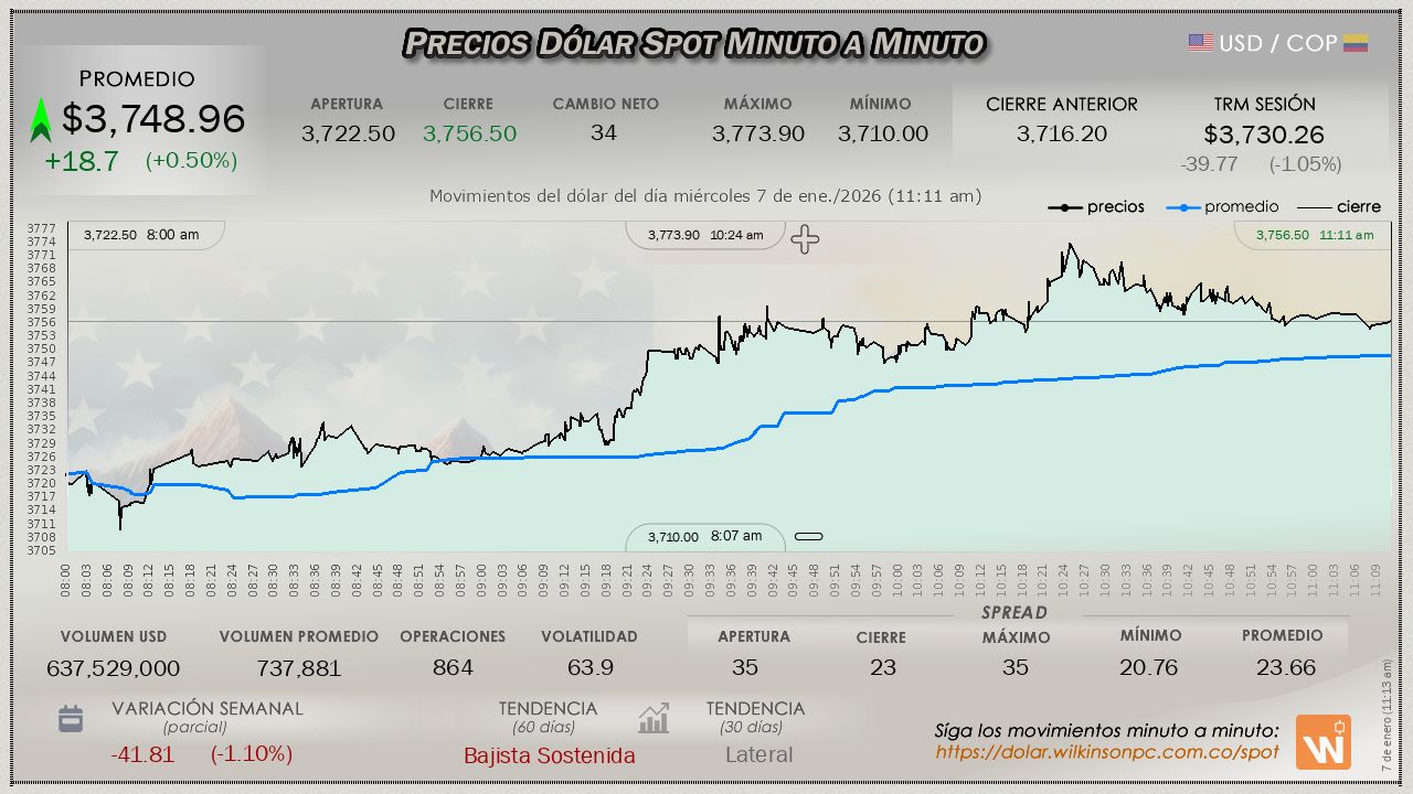 A lo largo del día miércoles, el dólar SPOT ha mantenido una tendencia ascendente, aunque la jornada comenzó con una caída, con un precio promedio de $3,748.93, un margen por encima de la TRM, aventajándola en $18.67 pesos (a pesar del ascenso, no logra recuperar lo perdido en la sesión anterior), la TRM mencionada asignada en $3,730.26 para la sesión.