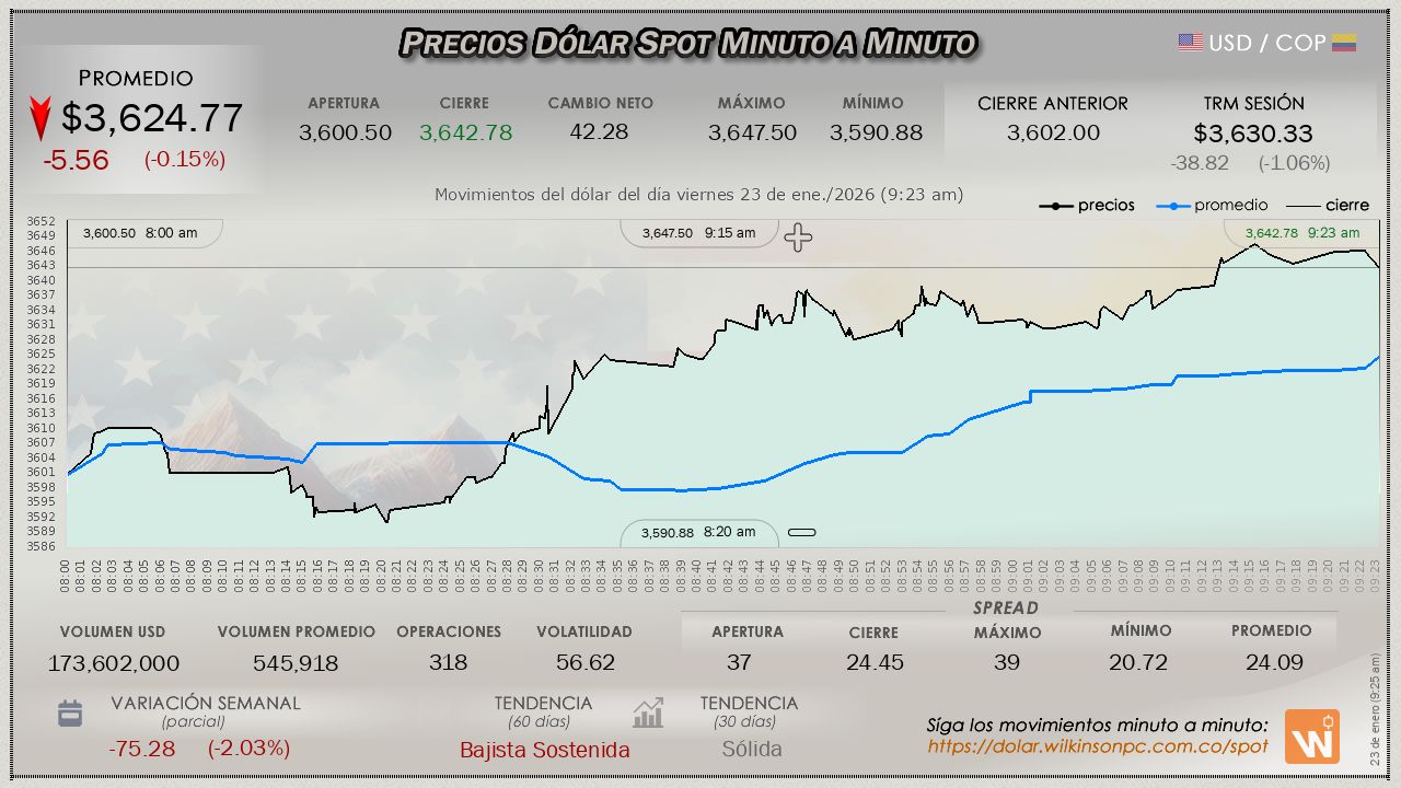 Estas velas reflejan el mercado internacional (Forex). Úselas para analizar tendencias, teniendo en cuenta que el precio puede variar ligeramente respecto al mercado oficial SPOT de Colombia.