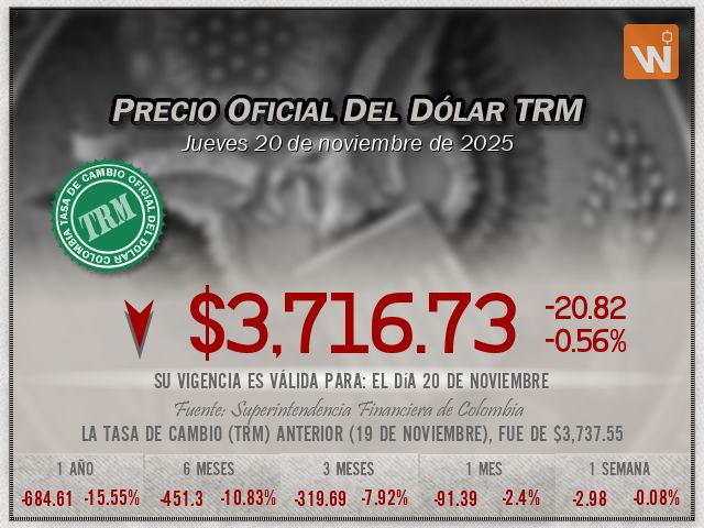 Esta es la TRM vigente del jueves 20 de noviembre de 2025. Un (1) dólar estadounidense equivale a $3,716.73 (tres mil setecientos dieciséis pesos con setenta y tres centavos colombianos).