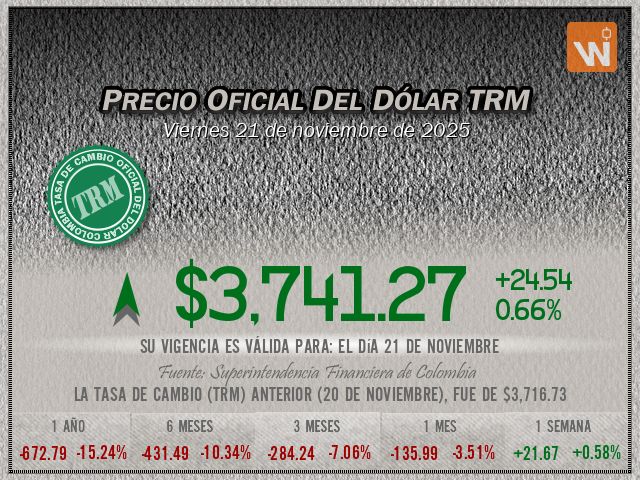 Esta es la TRM vigente del viernes 21 de noviembre de 2025. Un (1) dólar estadounidense equivale a $3,741.27 (tres mil setecientos cuarenta y un pesos con veintisiete centavos colombianos).