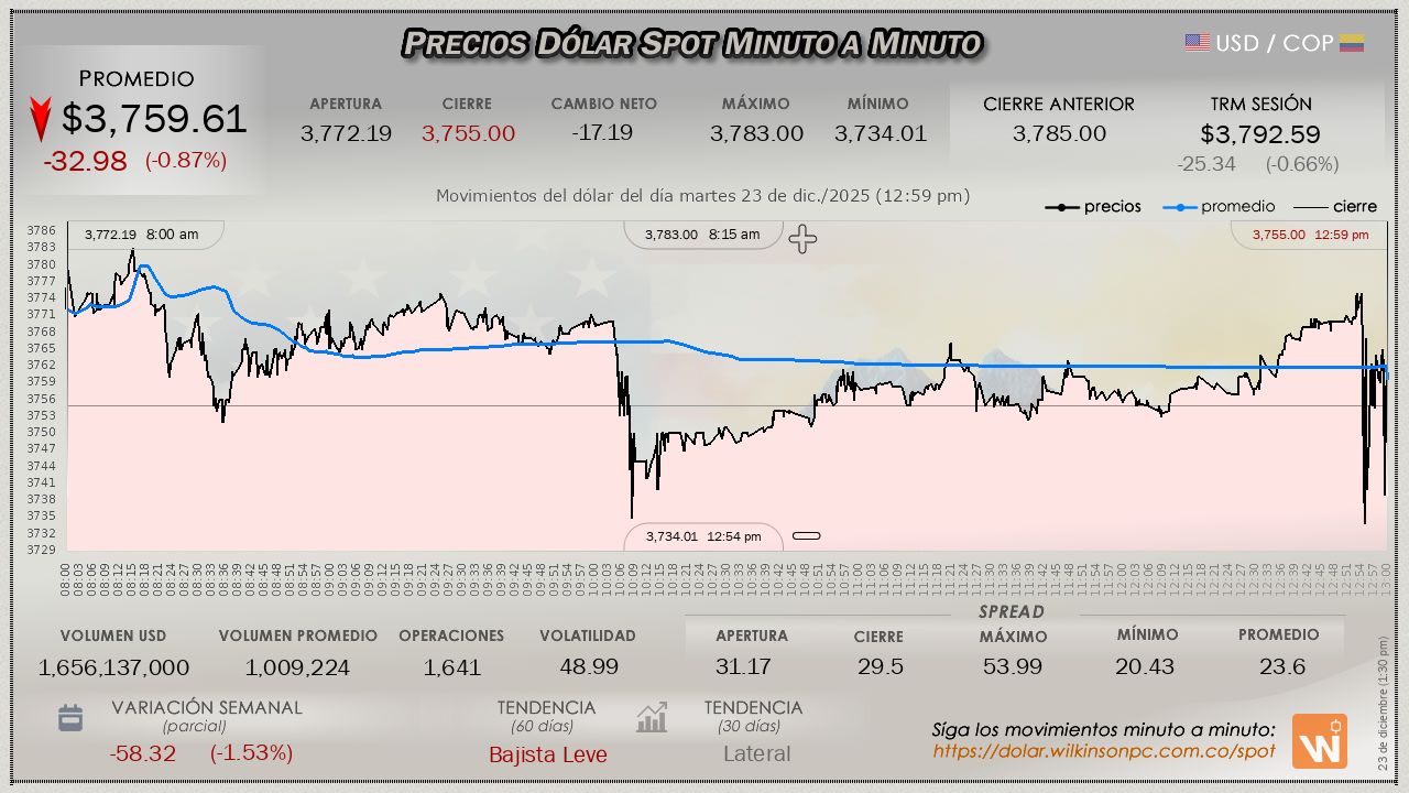 El martes, en la sesión del mercado SPOT, el dólar muestra un descenso continuado desde la apertura, a un precio corriente de $3,761.81, con un margen por debajo de la TRM, siendo inferior en $-30.78 pesos (ampliando las pérdidas de la jornada previa), la TRM en cuestión establecida en $3,792.59 para la sesión.