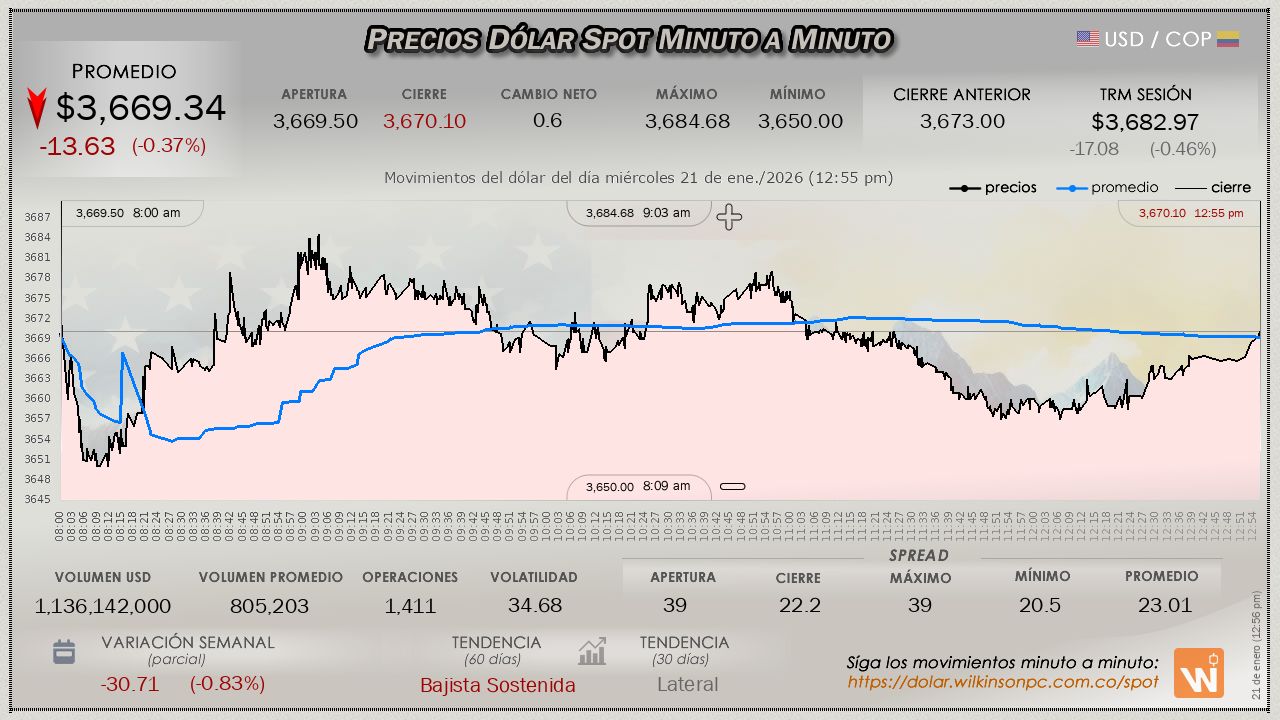 Estas velas reflejan el mercado internacional (Forex). Úselas para analizar tendencias, teniendo en cuenta que el precio puede variar ligeramente respecto al mercado oficial SPOT de Colombia.