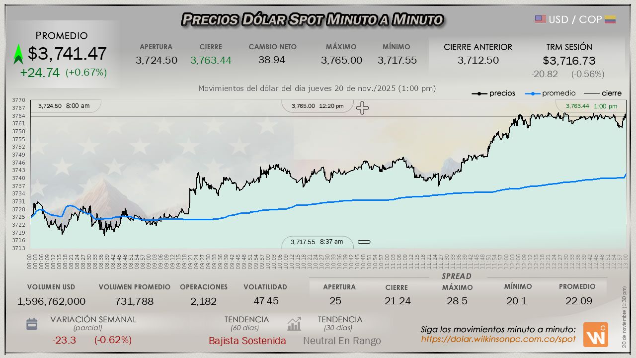 Esta es la TRM vigente del jueves 20 de noviembre de 2025. Un (1) dólar estadounidense equivale a $3,716.73 (tres mil setecientos dieciséis pesos con setenta y tres centavos colombianos).