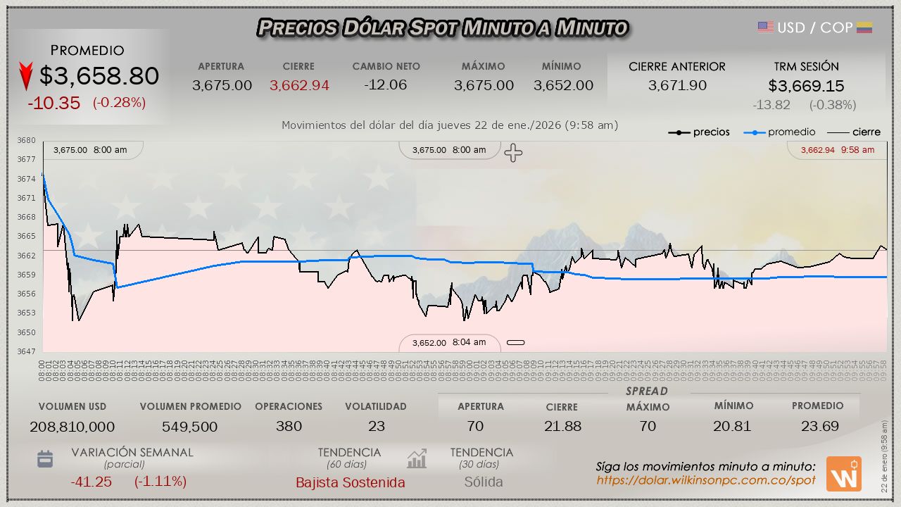 Estas velas reflejan el mercado internacional (Forex). Úselas para analizar tendencias, teniendo en cuenta que el precio puede variar ligeramente respecto al mercado oficial SPOT de Colombia.