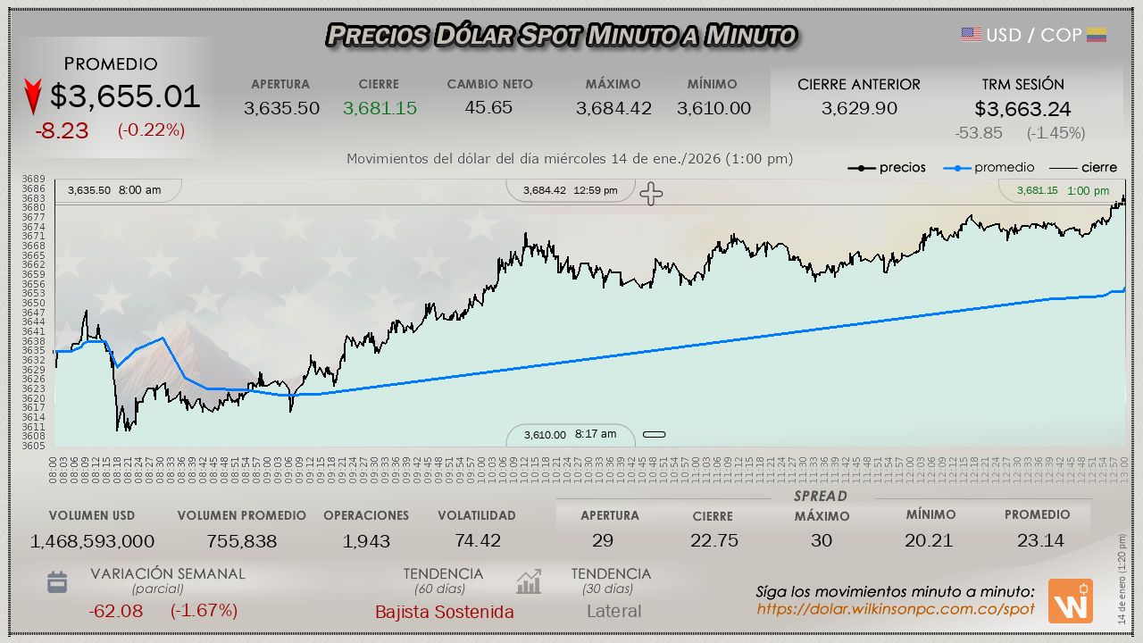 Esta es la TRM vigente del miércoles 14 de enero de 2026. Un (1) dólar estadounidense equivale a $3,663.24 (tres mil seiscientos sesenta y tres pesos con veinticuatro centavos colombianos).