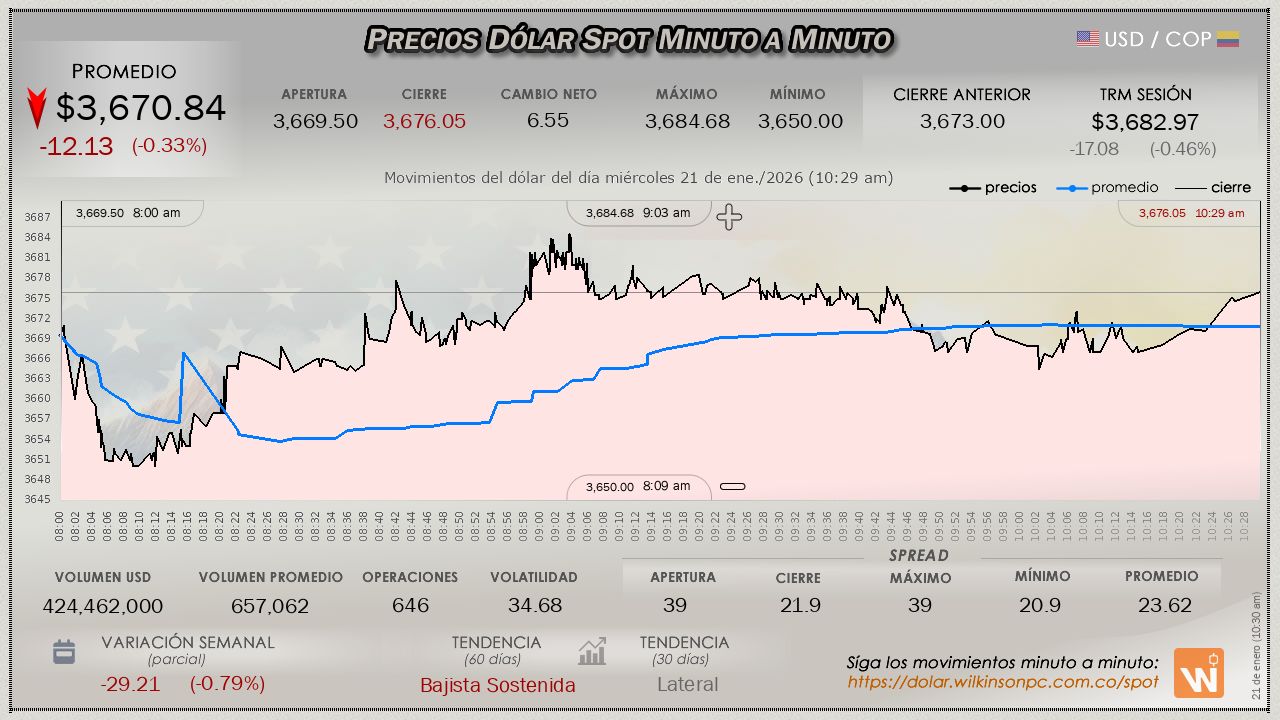 Estas velas reflejan el mercado internacional (Forex). Úselas para analizar tendencias, teniendo en cuenta que el precio puede variar ligeramente respecto al mercado oficial SPOT de Colombia.