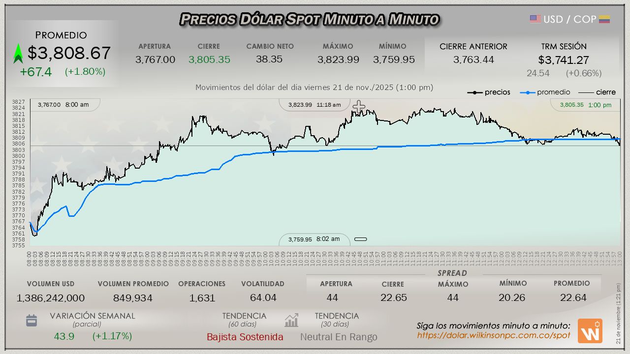En el mercado SPOT, el dólar finalizó la jornada del viernes, evidenciando un incremento consistente desde el comienzo de la jornada, con un precio promedio de $3,808.67, terminó experimentando un incremento significativo, superando la Tasa Representativa del Mercado (TRM) por un margen de $67.40 pesos, dicha TRM fijada en $3,741.27 para la sesión.