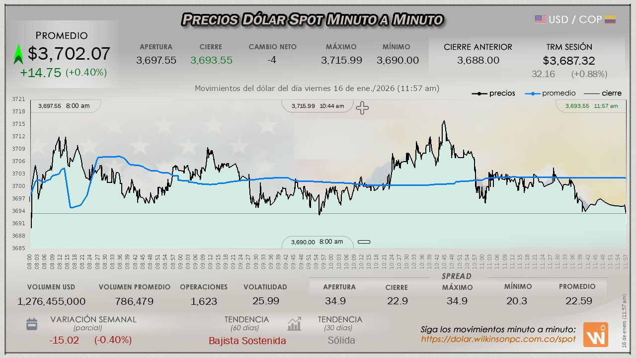 Esta es la TRM vigente del viernes 16 de enero de 2026. Un (1) dólar estadounidense equivale a $3,687.32 (tres mil seiscientos ochenta y siete pesos con treinta y dos centavos colombianos).