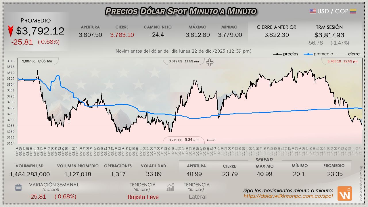 El lunes, en la sesión del mercado SPOT, el dólar muestra un descenso continuado desde que inició la jornada, con un valor corriente de $3,792.06, registrando una desventaja frente a la TRM de $-25.87 pesos (ampliando las pérdidas de la jornada previa), la TRM establecida para la sesión es de $3,817.93.