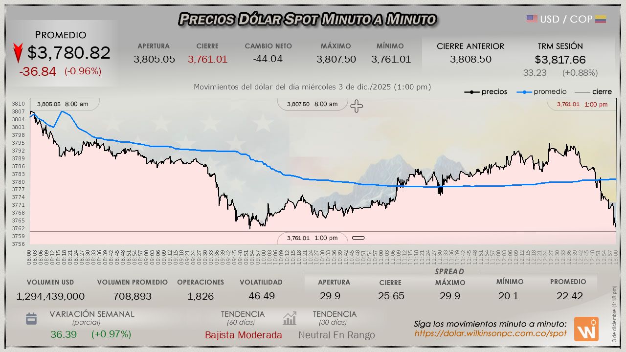 El cierre del mercado SPOT del día jueves, evidenció un descenso continuado desde que inició la jornada, con un precio promedio de $3,757.95, modestamente por debajo de la Tasa Representativa del Mercado (TRM), evidenciando un descuento de $-22.85 pesos, la TRM en cuestión establecida en $3,780.80 para la sesión.