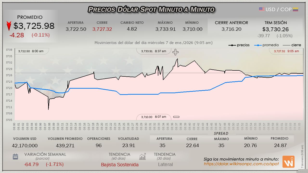 Esta es la TRM vigente del miércoles 7 de enero de 2026. Un (1) dólar estadounidense equivale a $3,730.26 (tres mil setecientos treinta pesos con veintiséis centavos colombianos).
