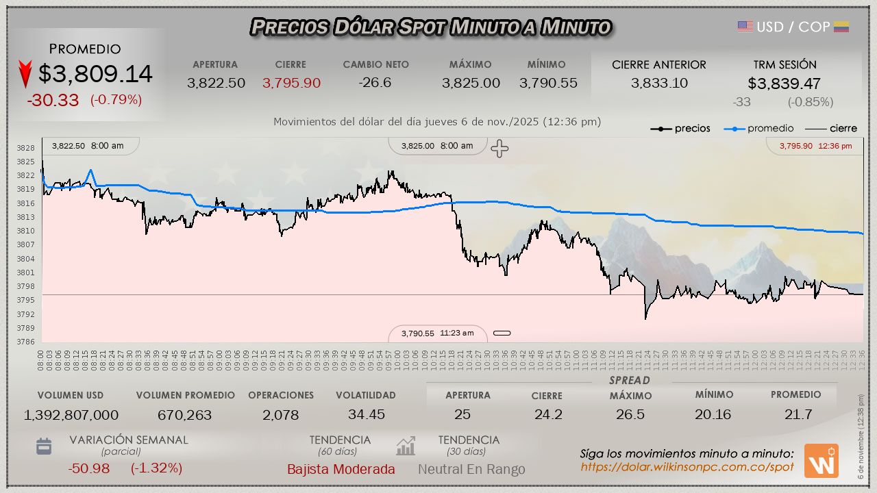 El mercado del dólar SPOT, en la jornada del jueves, tiene una tendencia a la baja desde el arranque de la sesión, con un valor medio de $3,809.14, sufriendo una disminución considerable, notablemente inferior a la Tasa Representativa del Mercado (TRM) con un diferencial de $-30.33 pesos (aumentando las pérdidas de la sesión anterior), la TRM referida fijada en $3,839.47 para el día.