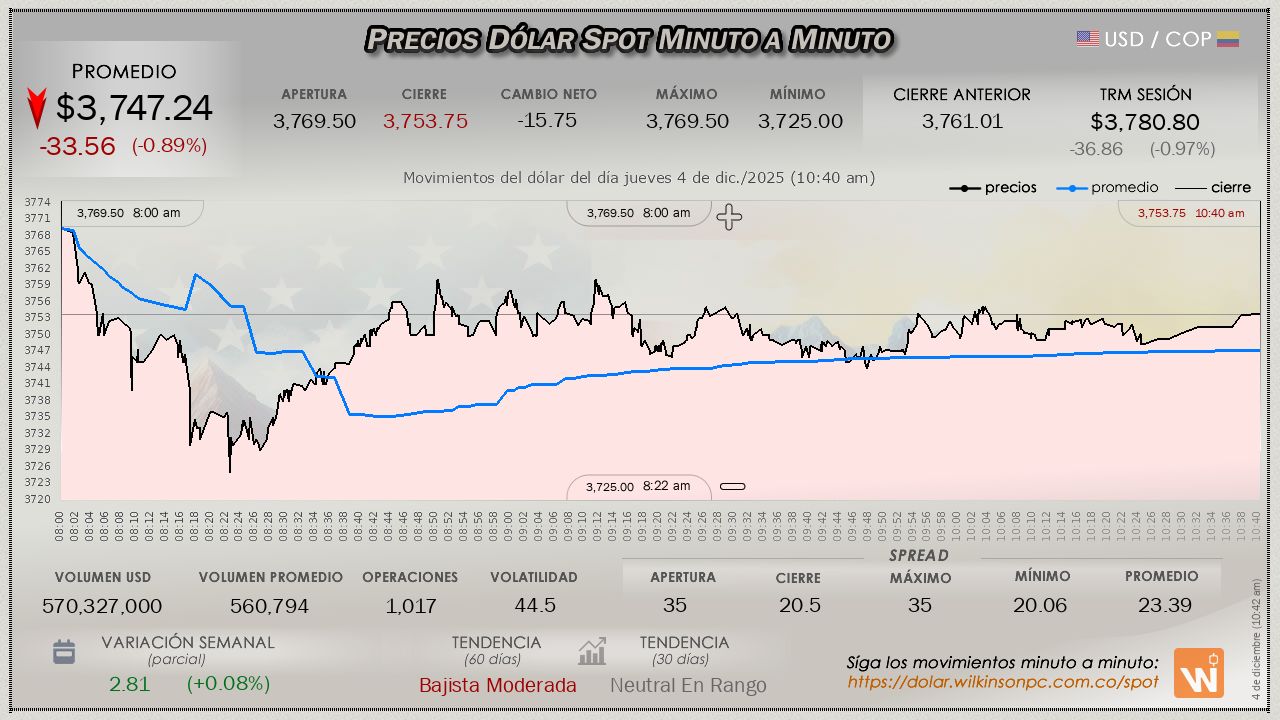 El mercado del dólar SPOT, en la jornada del jueves, tiene un descenso continuado desde que inició la jornada, con un valor corriente de $3,747.24, atravesando una depreciación importante, considerablemente por debajo de la Tasa Representativa del Mercado (TRM) con una brecha de $-33.56 pesos (aumentando las pérdidas de la sesión anterior), la TRM referida fijada en $3,780.80 para el día.