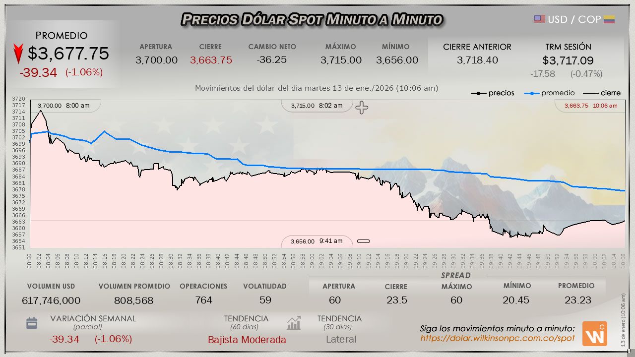 A esta hora del martes, en la sesión del mercado SPOT, el dólar muestra una tendencia a la baja desde el arranque de la sesión, con un precio promedio de $3,677.75, experimentando una pérdida significativa, muy por debajo de la TRM con un margen de $-39.34 pesos (ampliando las pérdidas de la jornada previa), la TRM referida fijada en $3,717.09 para el día.
