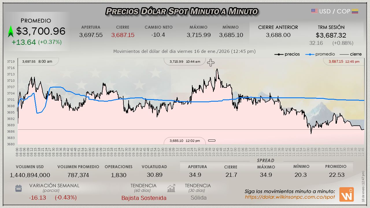 El cierre del mercado SPOT del día lunes, evidenció una disminución en comparación con el impulso inicial de la jornada y siguió en descenso, con un precio promedio de $3,770.42, cerró modestamente por debajo de la Tasa Representativa del Mercado (TRM), evidenciando un descuento de $-20.35 pesos, la TRM referida fijada en $3,790.77 para el día.
