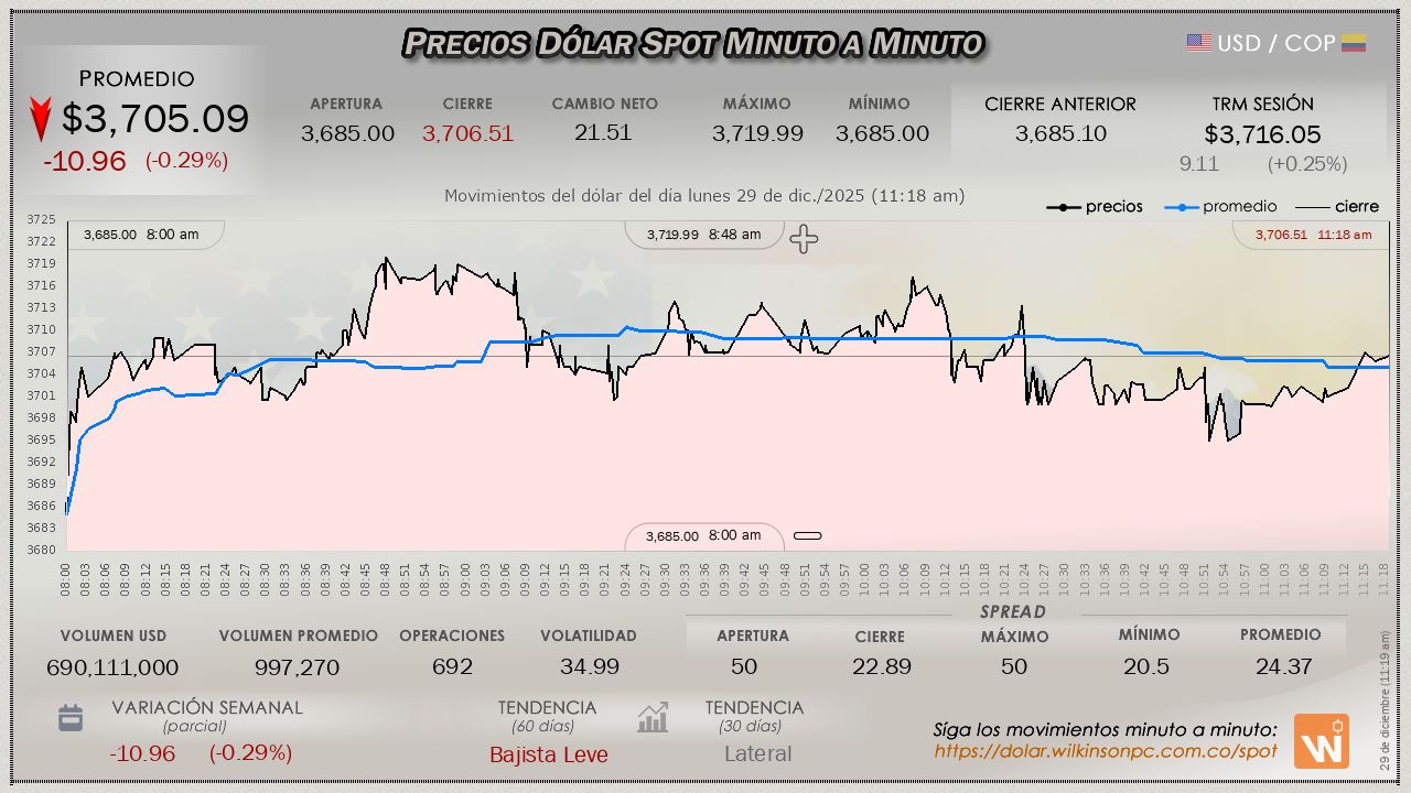 A esta hora del lunes, en la sesión del mercado SPOT, el dólar muestra un aumento únicamente en comparación con su valor al inicio de la sesión, con un valor corriente de $3,709.20, una caída muy leve de $-6.85 pesos (aún con la tendencia a la baja, no consigue erosionar las ganancias de la jornada previa), respecto a la TRM oficial, que para la sesión estaba en $3,716.05.