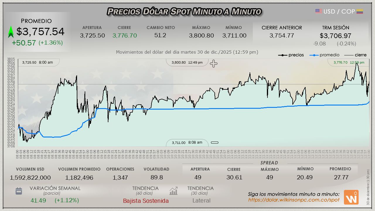 El martes, la última sesión del año (justo antes de la celebración de Año Nuevo), en la sesión del mercado SPOT, el dólar muestra un firme movimiento ascendente manifestado desde el comienzo del día, con un valor corriente de $3,751.86, marcando una tendencia alcista notable, alejándose de la TRM por $44.89 pesos (experimenta una recuperación vigorosa de las pérdidas de la sesión anterior), la TRM establecida para la sesión es de $3,706.97.