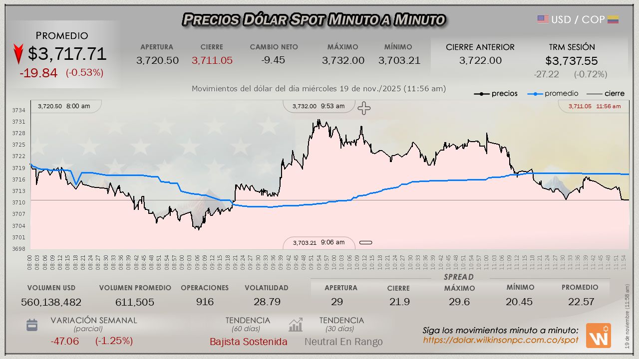 En el transcurso del día miércoles, el dólar ha mantenido un descenso continuado desde la apertura, con un valor medio de $3,717.71, por debajo de la Tasa Representativa del Mercado (TRM), de $-19.84 pesos (aumentando las pérdidas de la sesión anterior), la TRM establecida para la sesión es de $3,737.55.