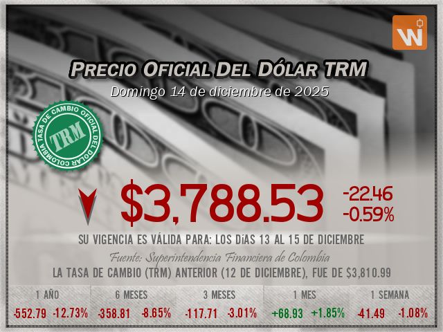 Esta es la TRM vigente del domingo 14 de diciembre de 2025, con validez desde el sábado 13 hasta mañana lunes 15 de diciembre. Un (1) dólar estadounidense equivale a $3,788.53 (tres mil setecientos ochenta y ocho pesos con cincuenta y tres centavos colombianos).