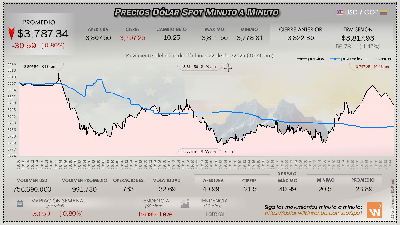 El mercado del dólar SPOT, dió cierre a la jornada del martes, evidenciando un descenso continuado desde que inició la jornada, con un precio promedio de $3,759.61, cerró modestamente por debajo de la Tasa Representativa del Mercado (TRM), evidenciando un descuento de $-32.98 pesos, la TRM en cuestión establecida en $3,792.59 para la sesión.