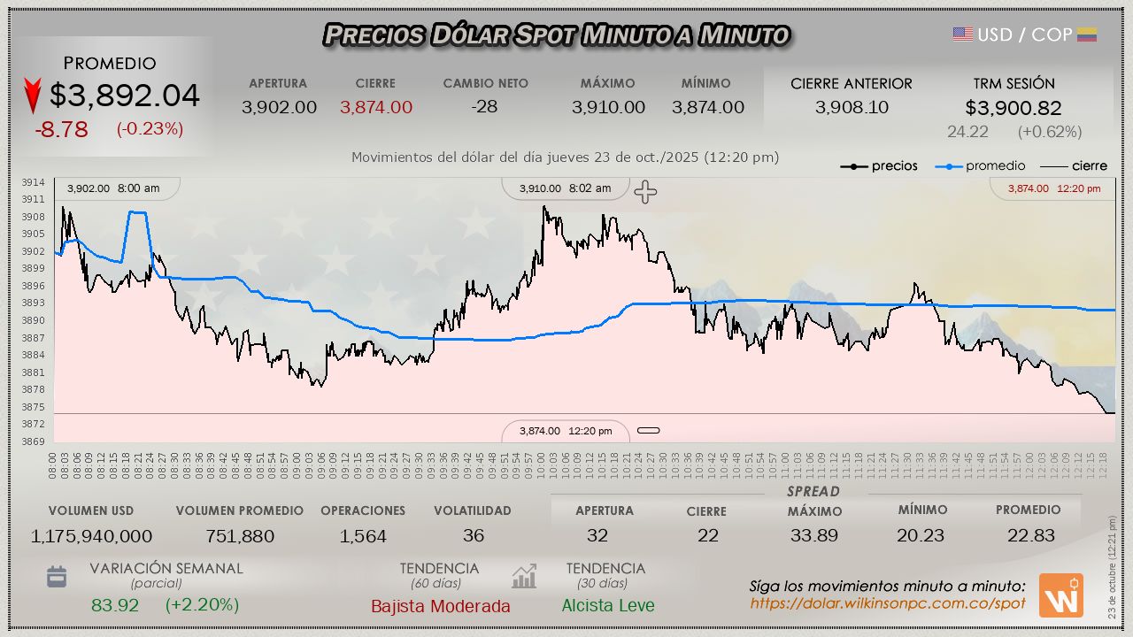 A esta hora el mercado SPOT del día jueves, muestra una pérdida respecto al impulso con el que inició la jornada y continúa a la baja, con un precio medio de $3,897.66, escasamente por debajo de $-3.16 pesos (aún con la tendencia a la baja, no consigue erosionar las ganancias de la jornada previa), de la Tasa Representativa del Mercado (TRM), fijada en $3,900.82 para la sesión.