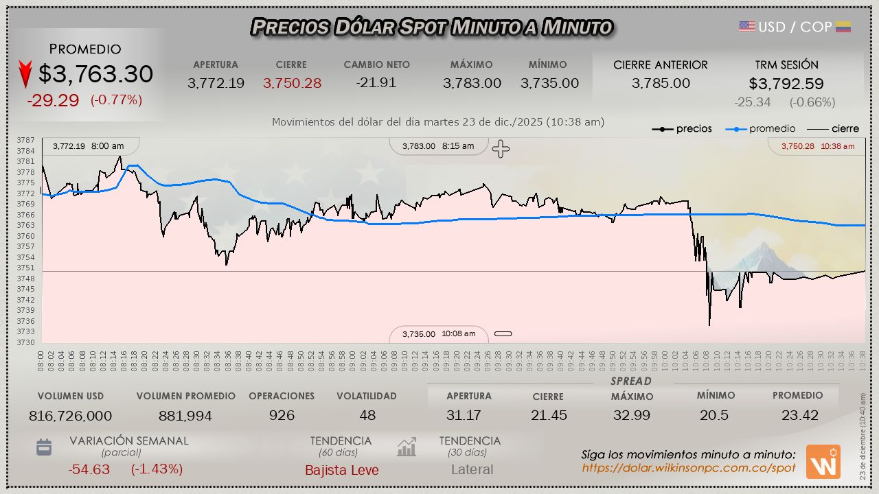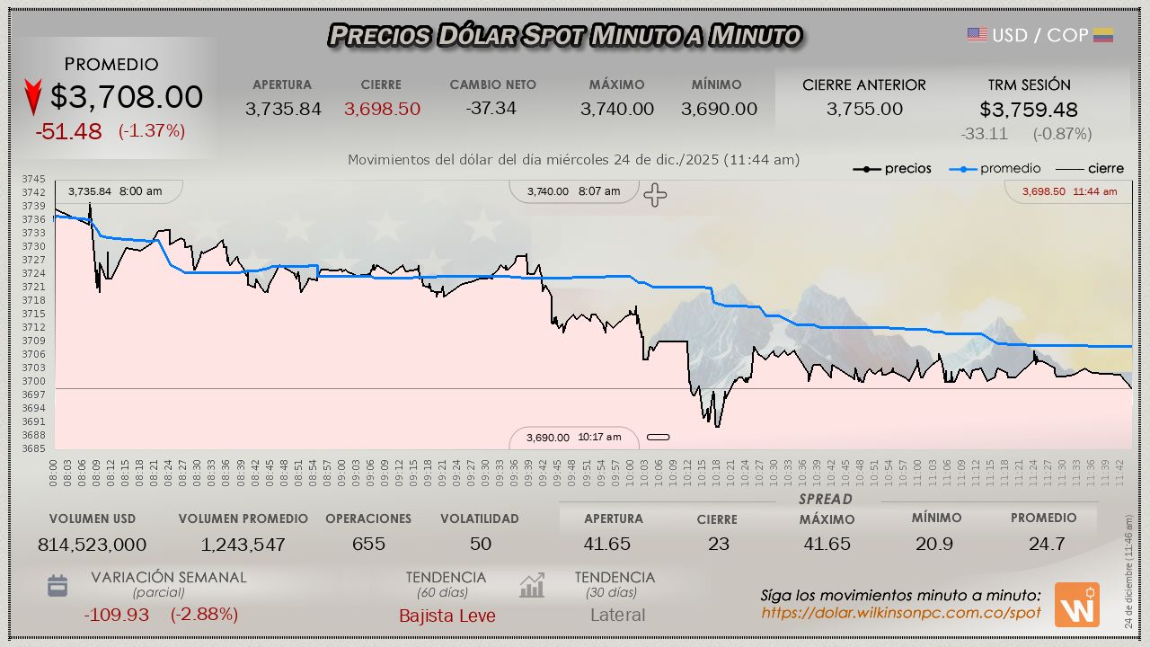 En lo transcurrido hasta el momento de la sesión del día miércoles (hoy es Nochebuena), el dólar mantiene un descenso continuado desde la apertura, con un valor medio de $3,722.10, desplomándose de manera notable frente a la TRM, al perder $-37.38 pesos (aumentando las pérdidas de la sesión anterior), dicha TRM fijada en $3,759.48 para la sesión.