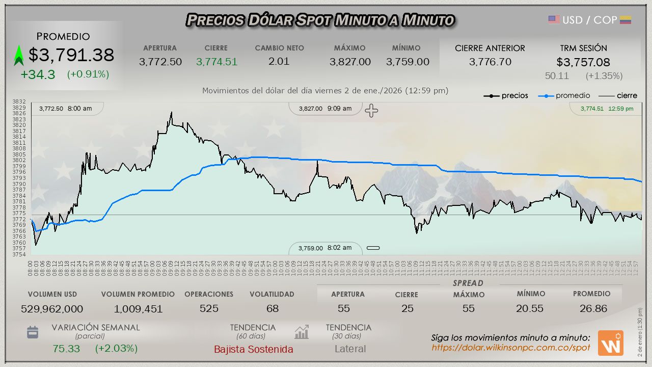 A esta hora el mercado SPOT del día viernes, la primera sesión del año, mantiene un firme movimiento ascendente manifestado desde el comienzo del día, con un valor promedio de $3,795.03, marcando una tendencia alcista notable, alejándose de la TRM por $37.95 pesos (potenciando las ganancias de la jornada previa), la TRM mencionada asignada en $3,757.08 para la sesión.