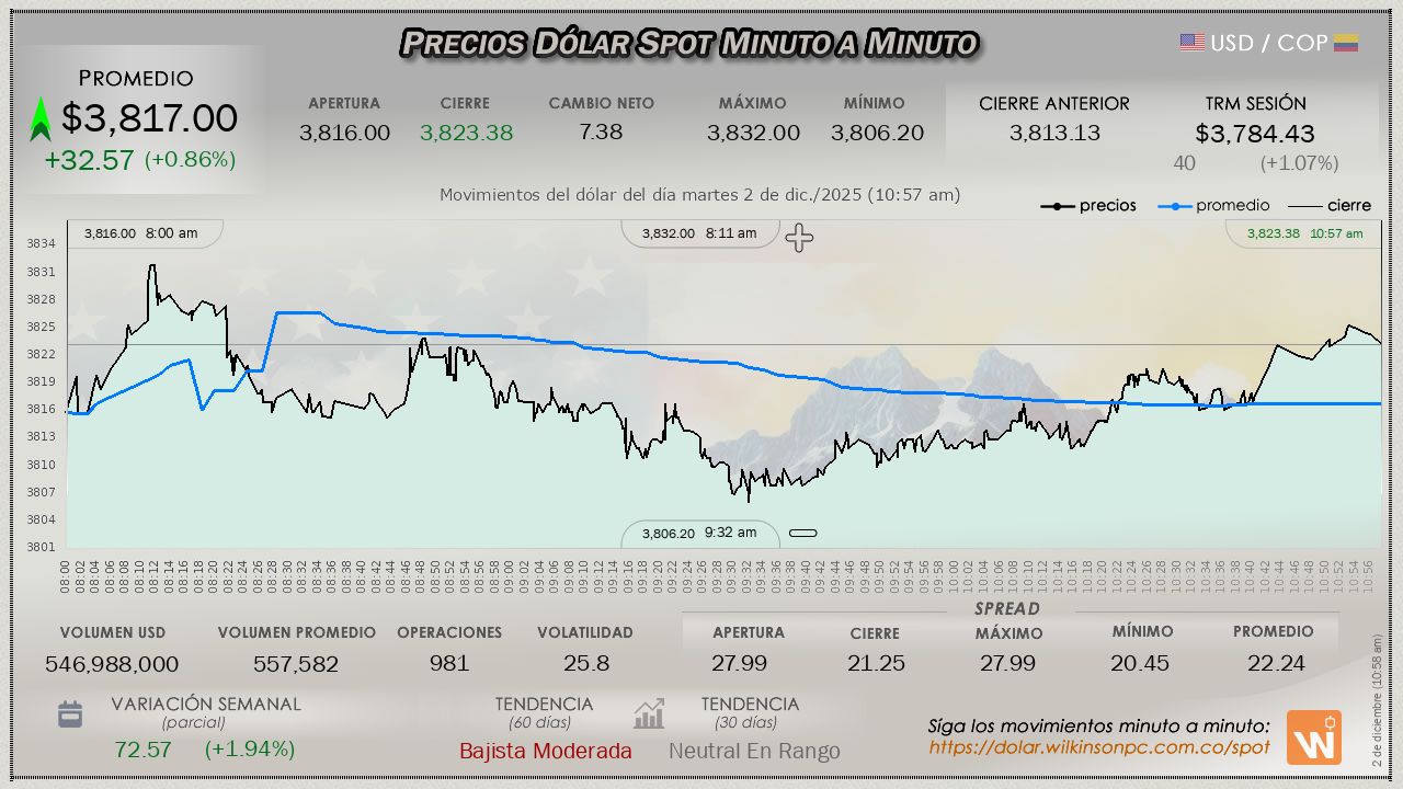 En lo que va de la jornada del mercado SPOT del martes (justo antes del día del Médico), el dólar muestra un incremento consistente desde el comienzo de la jornada, con un precio promedio de $3,816.88, experimentando un incremento significativo, superando la Tasa Representativa del Mercado (TRM) por un margen de $32.45 pesos (potenciando las ganancias de la jornada previa), la TRM en cuestión establecida en $3,784.43 para la sesión.