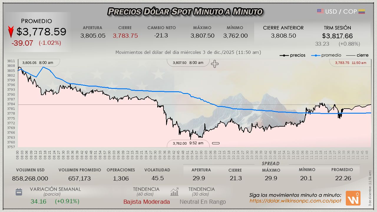 En el transcurso del día miércoles (día del Médico), en el mercado SPOT, el dólar ha mantenido un descenso continuado desde la apertura, con un precio promedio de $3,778.41, desplomándose de manera notable de la Tasa Representativa del Mercado (TRM), al perder $-39.25 pesos (restando las ganancias obtenidas en la jornada previa), dicha TRM fijada en $3,817.66 para la sesión.