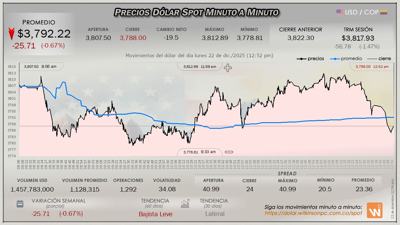 En el transcurso del día lunes, el dólar ha mantenido una tendencia a la baja desde el arranque de la sesión, a un precio corriente de $3,789.04, inferior a la Tasa Representativa del Mercado, quedándose por debajo en $-28.89 pesos (aumentando las pérdidas de la sesión anterior), la TRM establecida para la sesión es de $3,817.93.