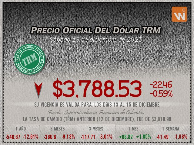 Esta es la TRM vigente del sábado 13 de diciembre de 2025, estará en efecto desde la fecha de hoy sábado, hasta el 15 de diciembre inclusive. Un (1) dólar estadounidense equivale a $3,788.53 (tres mil setecientos ochenta y ocho pesos con cincuenta y tres centavos colombianos).