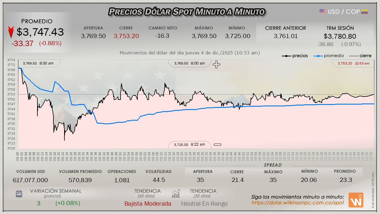 A esta hora del jueves, en la sesión del mercado SPOT, el dólar muestra un descenso continuado desde la apertura, con un valor corriente de $3,747.43, experimentando una pérdida significativa, muy por debajo de la Tasa Representativa del Mercado (TRM) con un margen de $-33.37 pesos (aumentando las pérdidas de la sesión anterior), la TRM mencionada asignada en $3,780.80 para la sesión.