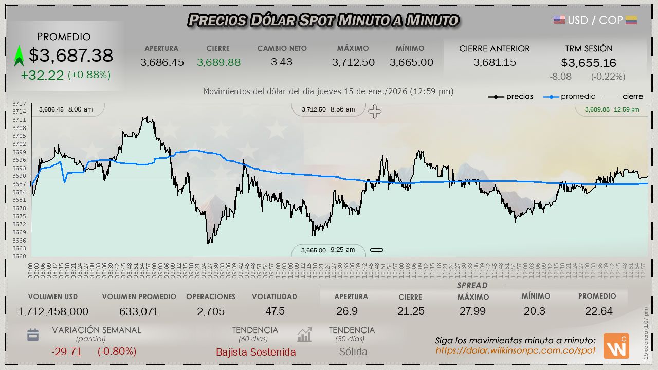 El mercado del dólar SPOT, en la jornada del jueves, tiene una sólida tendencia alcista desde el inicio de la jornada, con un precio medio de $3,687.38, una ventaja clara sobre la Tasa Representativa del Mercado, superándola en $32.22 pesos (experimenta una recuperación vigorosa de las pérdidas de la sesión anterior), la TRM establecida para la sesión es de $3,655.16.