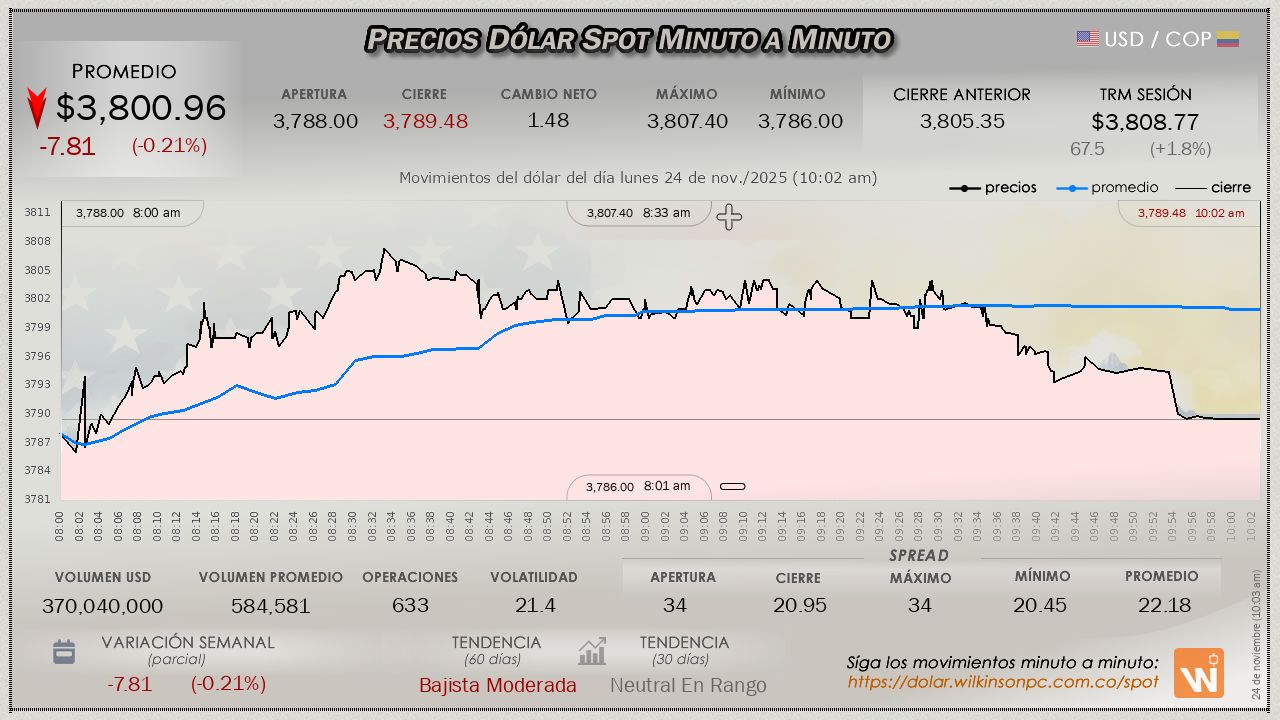 A esta hora el mercado SPOT del día lunes, muestra un aumento únicamente en comparación con su valor al inicio de la sesión, con un valor medio de $3,799.67, con una pequeña caída de $-9.10 pesos (aún con la tendencia a la baja, no consigue erosionar las ganancias de la jornada previa), comparada a la Tasa Representativa del Mercado (TRM), que para la sesión estaba en $3,808.77.