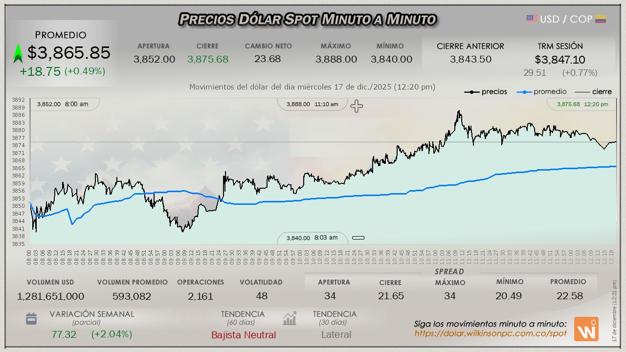A lo largo de la sesión de hoy en el mercado SPOT, el dólar ha registrado una sólida tendencia alcista desde el inicio de la jornada, con un precio medio de $3,865.85, cotizando por encima de la TRM con un diferencial de $18.75 pesos (incrementando las ganancias de la sesión anterior), la TRM en cuestión establecida en $3,847.10 para la sesión.