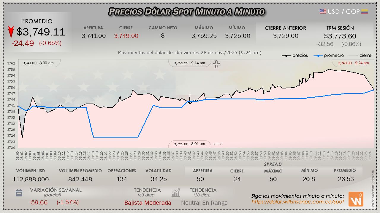 En esta primera hora del viernes, el dólar SPOT tiene una recuperación sólo respecto a la apertura de la sesión, con un precio medio de $3,744.54, con un margen por debajo de la Tasa Representativa del Mercado (TRM), inferior en $-29.06 pesos (ampliando las pérdidas de la jornada previa), la TRM mencionada asignada en $3,773.60 para la sesión.